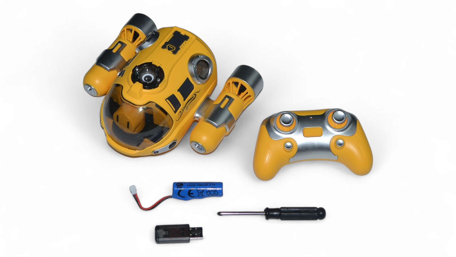 Батискаф поставляется в красочной коробке размером 22х20х10 см и весит всего 0,6 кг. Для работы пульта управления требуются 2 батарейки типа AA (не входят в комплект).